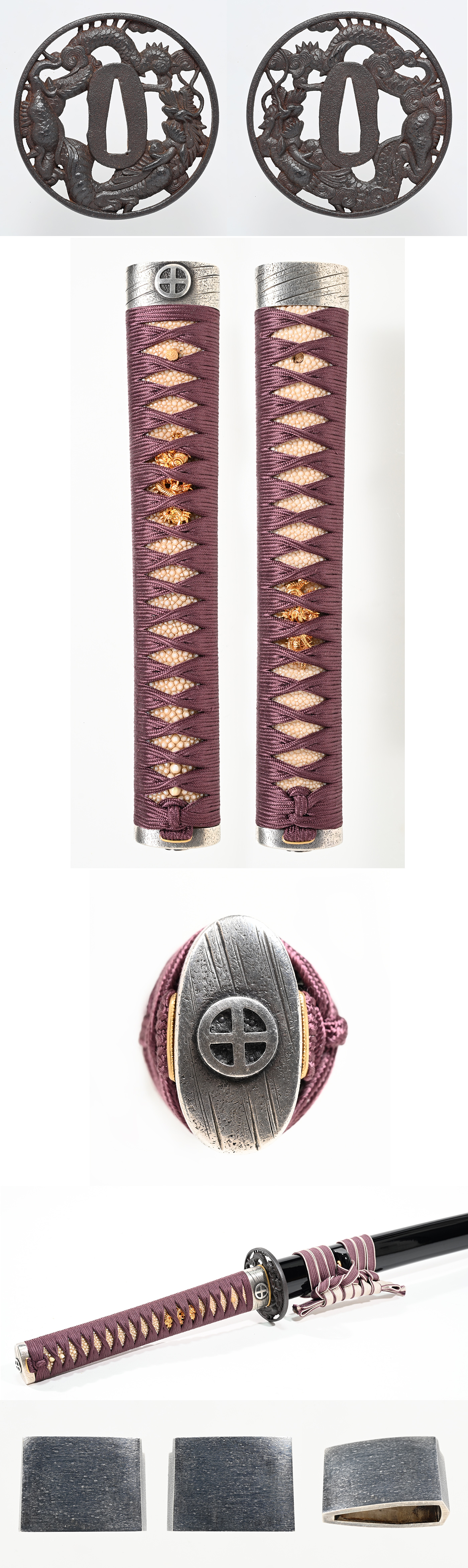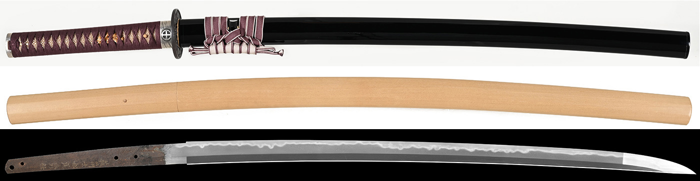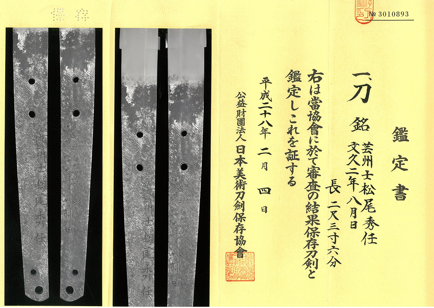 | 注文する/Order | 特徴:芸州士松尾秀任(ひでとう)は江戸の広島藩邸奥向き管理の役所に勤める武士で、本名は松尾助之丞、秀任は江戸赤坂の広島藩浅野家中屋敷内で釘・小 刀包丁等を作り、これを内職にして家計の足しにしていましたが、そのうち武士としては潔よい仕事ではない、恥ずかしくない物を作りたいと麹町に住む刀工の元へ行き技術を習得したと言われ、その刀工が幕末の新々刀最高位の刀工である源清麿であると推測される(赤坂から四 谷は1㎞前後の距離)見るからに作風は清麿を思わせ、地沸えよく付き、刃中は砂流し金筋入り匂口明るく冴える、茎の仕立ても大筋違で清麿の流れを汲んでいる事がうかがえる。 |