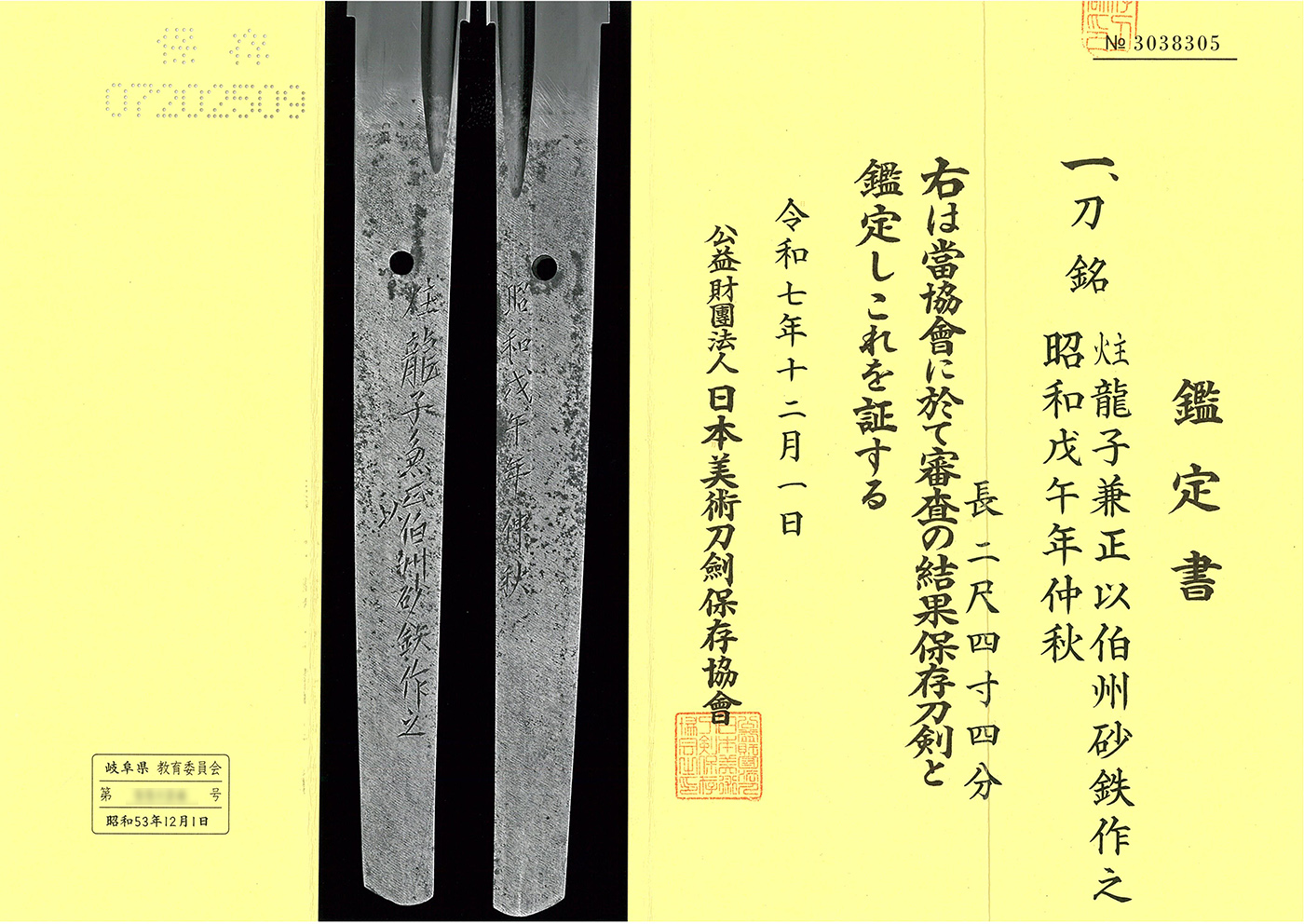特徴:炷龍子兼正は岐阜県の刀匠で本名を大野正已、大正12年生まれ、平成21年没(87歳)、兼正刀匠は自家製鉄による玉鋼で四方詰鍛法にこだわった刀鍛冶、1997年には県重要無形文化財に認定。