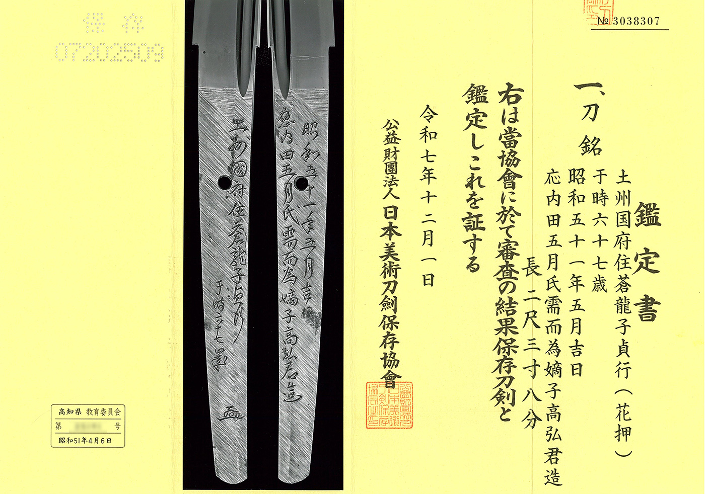 特徴:土州住蒼龍子貞行は本名を山村融、師は山村善貞(初代 川島忠善門人)新作刀展では五回入選している。