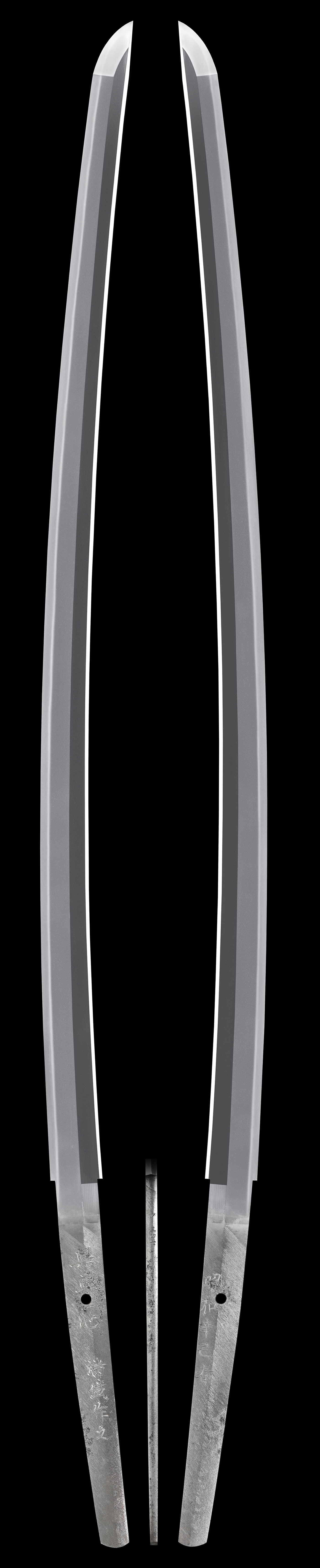 | 注文する/Order | 特徴:南満州鉄道中央研究所の日下和治博士を筆頭とするチームが、満州東辺道大栗子(だいりっし)で産する良質な鉄鉱石を低温精錬して得られたスポンジ鉄を再度溶解、成分調整して炭素量の多い鋼と炭素量の少ない純鉄(日下純鉄)を製造するのことを開発。これを用いてパイプ状に加工したのち日本刀に整形したものであり、古来の日本刀製法とは全く異なる。昭和十二年、同社大連鉄道工場が軍刀の大量生産を企画、翌十三年刀剣製作所設立、量産開始後の昭和十四年三月、松岡満鉄総裁により「興亜一心」と命名された。寒冷地で使用しても折れず曲がらずよく切れると評判となり、量産性も高いことから終戦までに約5万振りが生産された。初期名は「満鉄刀」と呼称していた為、これが通称となった。また、上記の経緯により、満鉄の鉄道レールを原料として製作されたというのは誤りである。近年では新規の登録は不可能とされていて、新たな発見や逆輸入など海外からの持ち込みも出来ず、現在登録証が付いているものだけとなり貴重となっています。本作は平成元年に刀剣徹斎の阿部義貞さんにしっかりとした研磨が施されいる |