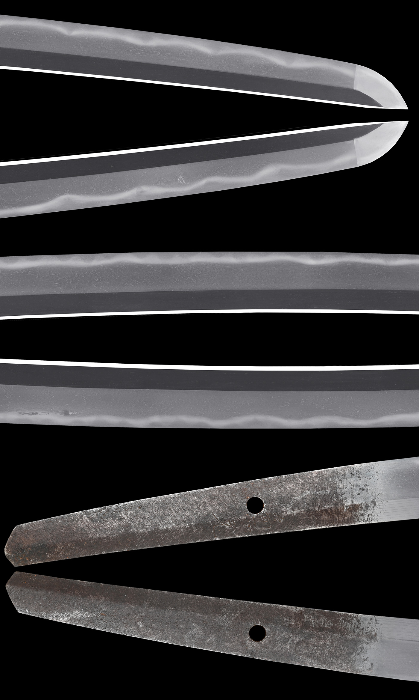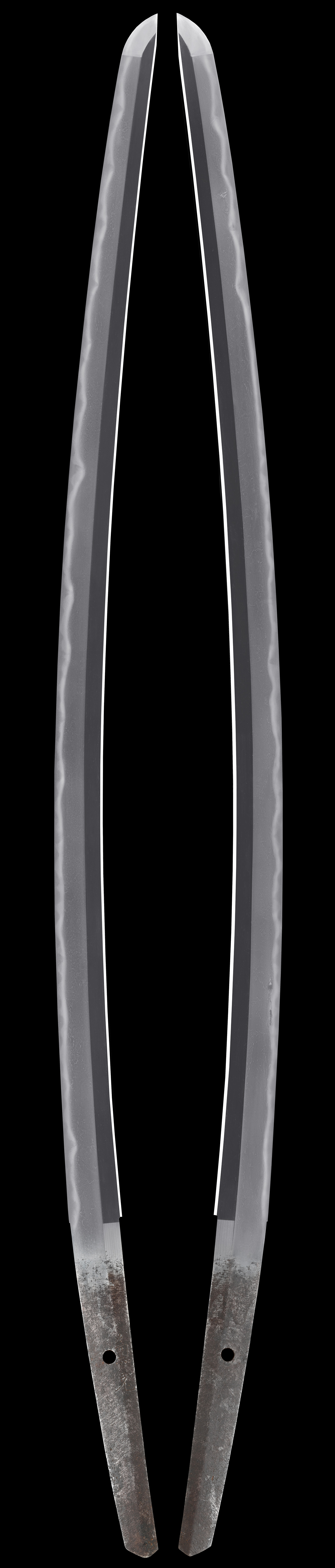 特徴:兼元は室町時代明応頃から現代まで続く刀工で、二代兼元を孫六と称して珍重される、世に知られる三本杉は孫六が有名ですが、後代の兼元になると三本杉がはっきりとし、孫六などは不規則な三本杉を焼いています。本作は古刀期の兼元で古刀期には数代兼元が続く