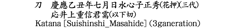 保存刀剣 刀 慶應乙丑年七月日水心子正秀(花押)(三代) 応井上重信君需(以下切) |