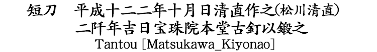 短刀 平成十二二年十月日清直作之(松川清直) 二阡年吉日宝珠院本堂古釘以鍛之 |