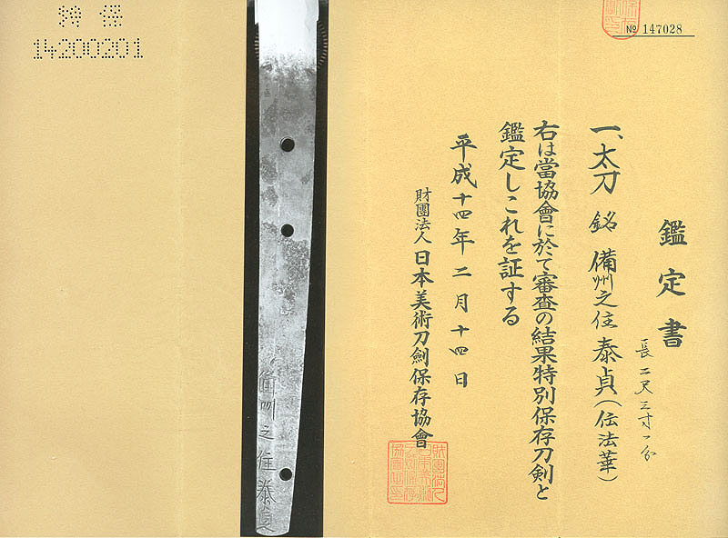 刀 備州之住泰貞(伝 法華) Katana [Yasusada] |