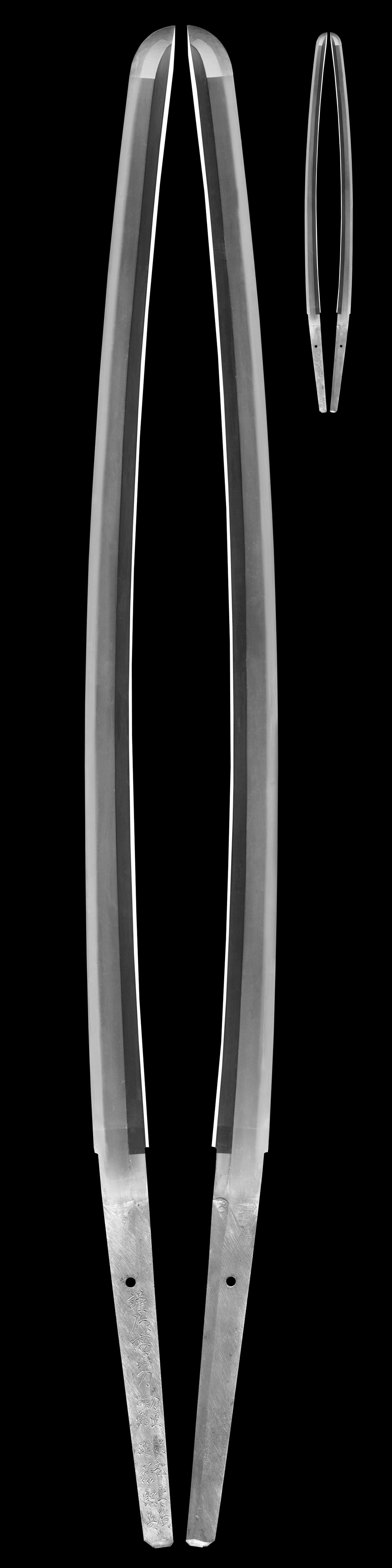 特徴:高山刀は海軍で実戦刀法を指導した高山政吉師範が考案した刀で、海上塩害対策としてステンレス鋼を用いて作られた刀身。本作は外装もオリジナルのままで切羽の番号は揃っています。