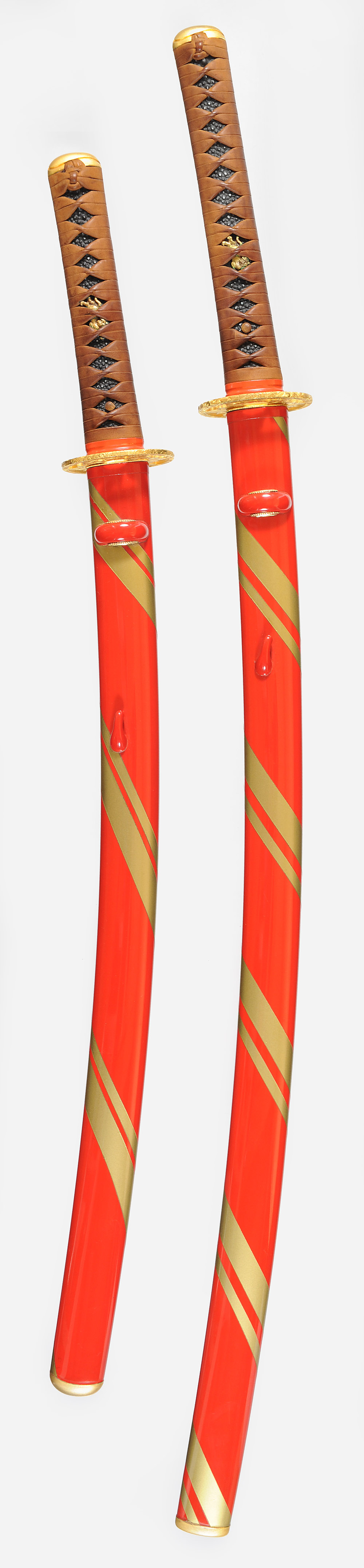 特徴:長船派は鎌倉時代から続く名門で、室町時代後期になると備前国では刀の需要に伴い数千名の刀鍛冶が活躍していた。本作には豊臣秀吉の指料としてとても有名な朱漆金蛭巻大小拵の写しが付いている、この拵えは近年制作された物である。