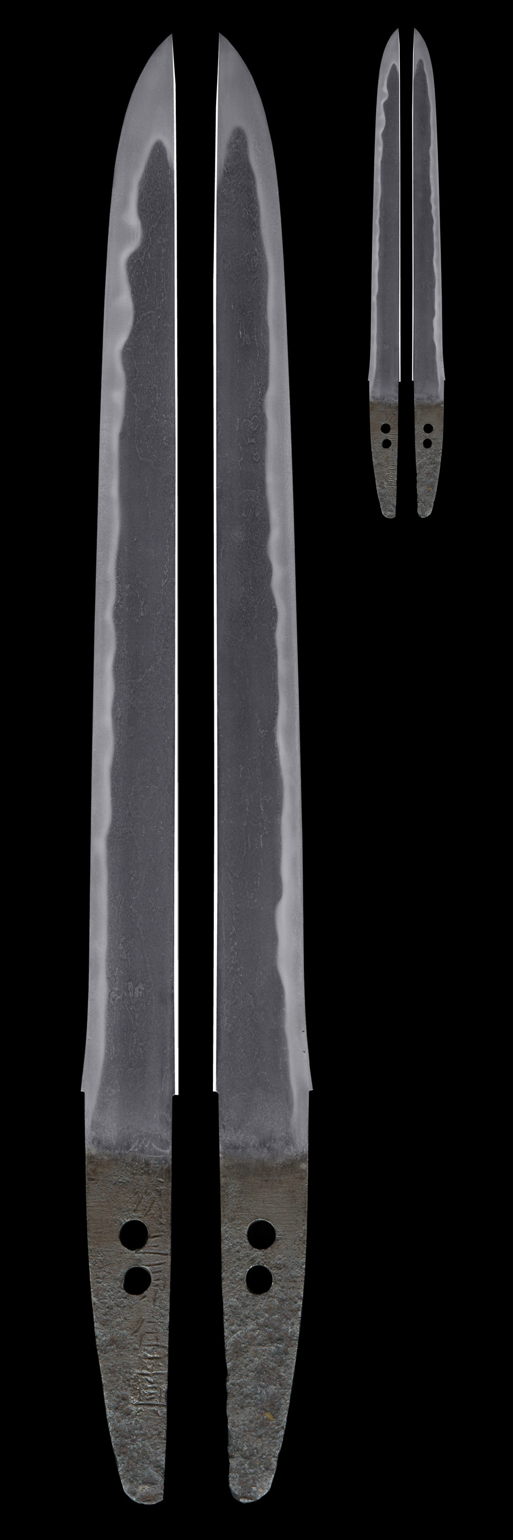 | 注文する/Order | 特徴:備後の国三原派は、遠く南北朝期前後に、大和国高野山領の荘園の大田庄があった関係で、尾道港の周辺の寺の門前に、大和手掻派の刀工が常駐し、作刀が広まったと伝わっている。室町時代に三原、木梨庄、貝の地名をいれた作品が見られるようになり、三原の場所とは現在の三原市は、当時海の中で、現在の三原市とは違う場所 であったと思われる。可能性が指摘されているのは、当時、この地方を支配していた杉原氏の居城 木梨の鷲尾山城下から、現在の太郎谷をくだった、中野町の川沿いが最近の研究で、可能性が高いと思われる。又、貝は、地名ではなく、屋号で、姓は藤原という苗字を使用している。現在の貝ヶ原という地名と強引に理由づけした 論文が発表され、一時期、貝ヶ原説が有名になったが、検証の結果、根拠の無い学説である。表題の短刀は、まだ中国山地の鉄山を尼子氏が支配する前の材料状態の良い時代の作品、銘に正奥と崩し字で銘が入れてあるが、最近の研究で興の崩し字ということが判明し、刀剣保存協会の保存鑑定書も追認した形となっている。全体の 姿が、なかご重ね厚く、手元に重心を置き、刃の中央が内反り風となる、通称 たけのこ反りの姿、室町中期の腰刀の典型的な姿、刃紋は穏やかな、互ノ目と、湾れ刃を交えた品の良い刃紋で、約500年ほど前の作品です。 |