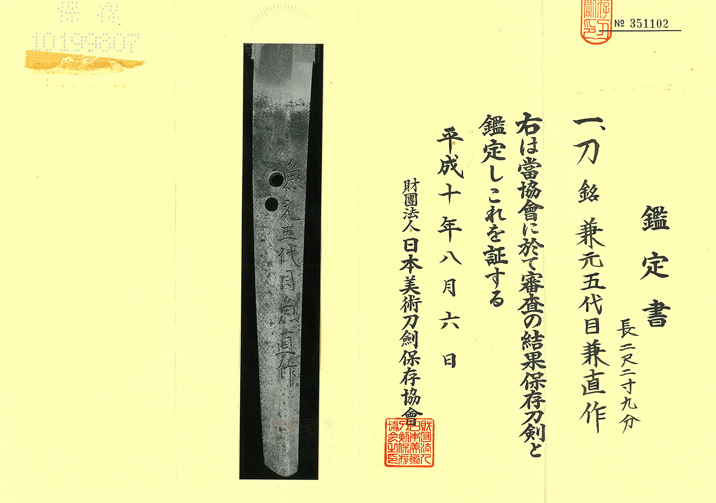 特徴:兼元は末関の代表工として知られ、和泉守兼定と共に有名である、兼元は初代(明応1492年)から二十七代兼元(平成)まで続く、本作は五代目にあたる兼元で作品少なく希少である。