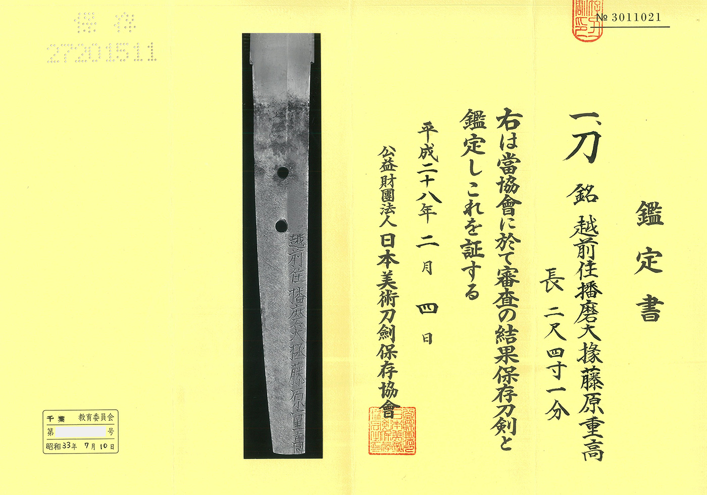 特徴:本作の播磨大掾藤原重高は二代の作品、重高は初代から11代江戸時代末期迄まで続く刀工