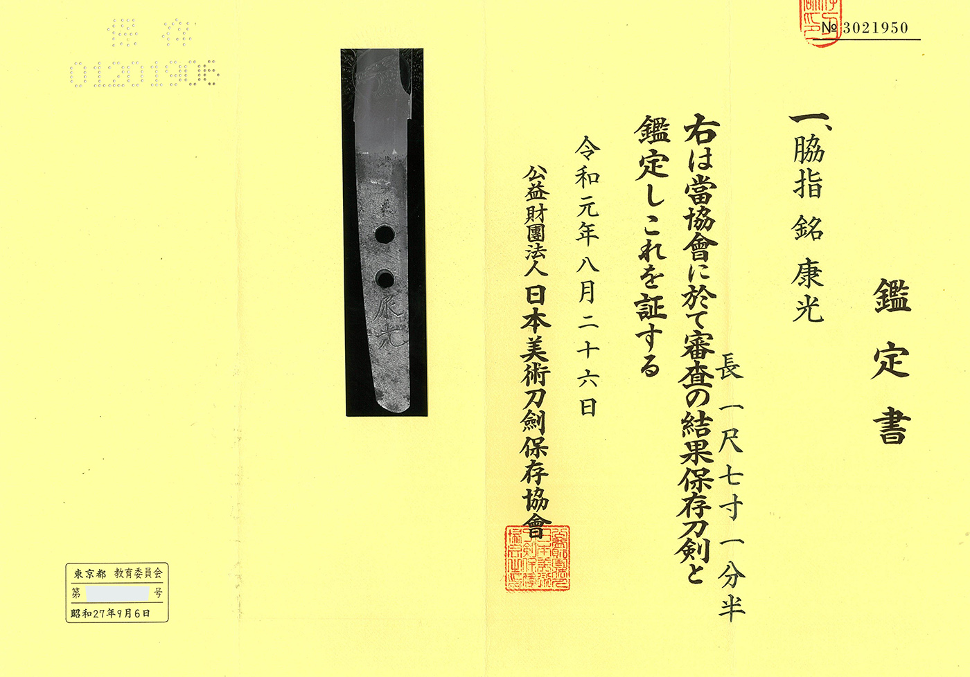 特徴:康光は盛光と共に応永備前の代表工と知られ人気も高い、本作は明治三十一年に池辺義象が佐々克堂(佐々友房)に贈った脇差、佐々克堂(佐々友房)の孫は初代内閣安全保障室長で日本美術刀剣保存協会7代会長の佐々淳行。