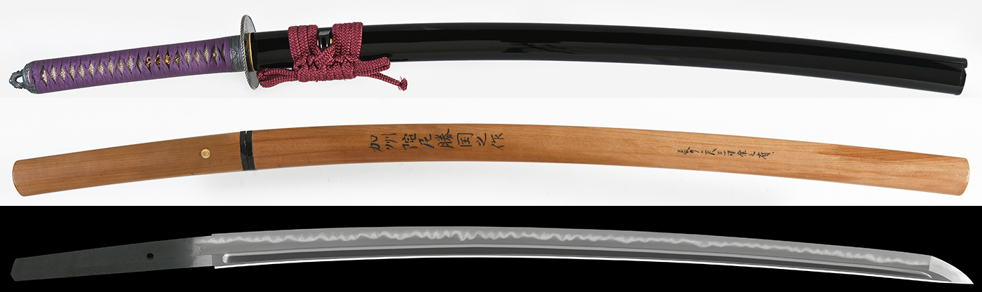 特徴:陀羅尼勝国は来国吉十七代の末孫で寛文1661年頃から明治まで続く加賀の名門で孫六兼元風の三本杉を得意とする、本作は三代目勝国で本名を松戸善助、陀羅尼勝国の得意とする三本杉を焼いている。