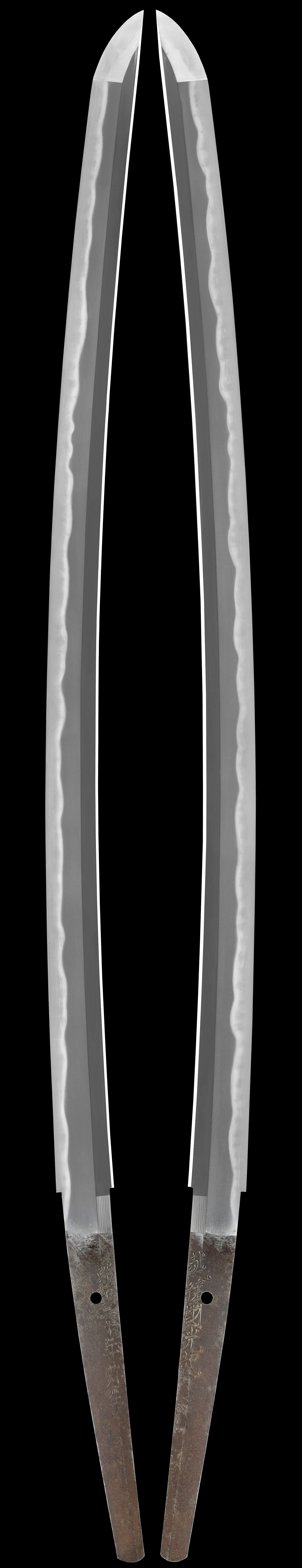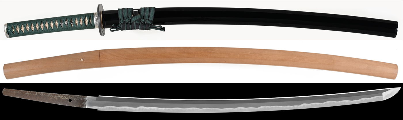 | 注文する/Order | 特徴:遠藤光起は本名を仁作、明治三十七年(1904年)新潟生まれ、昭和十年(1935年)に栗原彦三郎の運営する日本刀鍛錬伝習所に入門する、数年を経て新作名刀展で優秀賞や入選、特賞、日本刀大共進会優秀賞、日本刀展覧会特選4回、誉特選賞2回、金牌、総裁賞など多くの受賞を果たします、1939年(昭和14年)には、後鳥羽天皇700年祭奉賛会にて日本刀を奉納、1945年(昭和20年)には当時の海軍大将・山本五十六(やまもといそろく)の記念刀を鍛刀します、その後も、伊勢神宮を始め名だたる神社仏閣に刀剣を奉納し、1981年(昭和56年)には財団法人日本美術刀剣保存協会によって無鑑査に認定されました。本作は出来、保存状態が良く特別保存になっている |