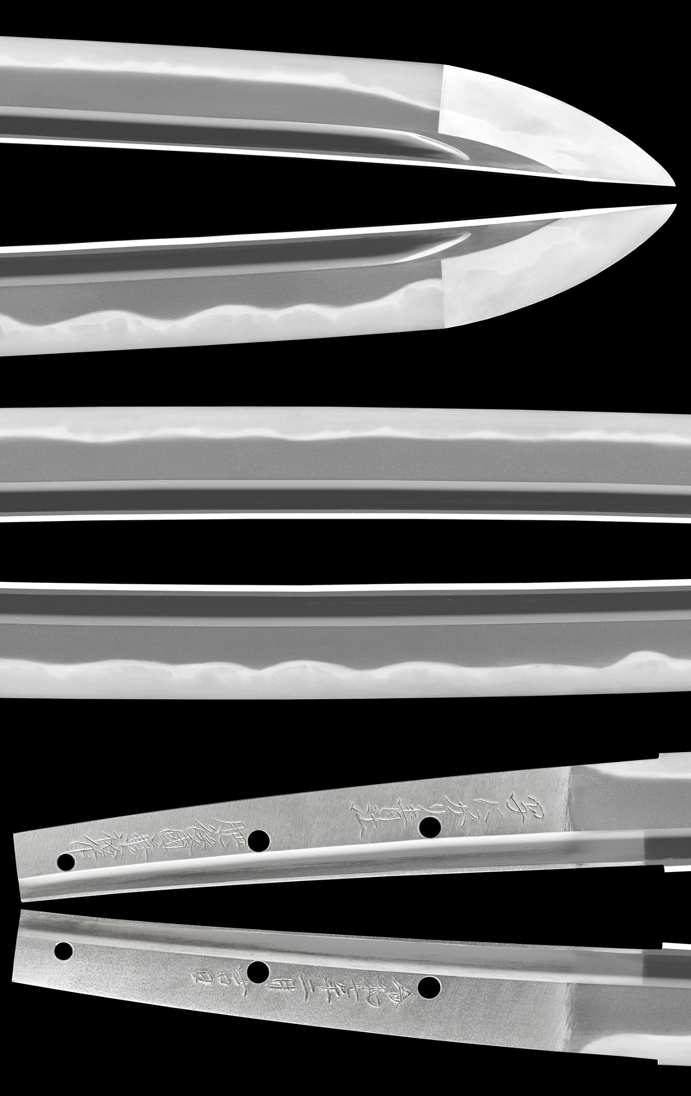 | 注文する/Order | 特徴:肥後國兼裕(赤松太郎兼裕)は本名を木村馨、昭和36年(1961年)生 本作は特別に注文打ちで造られたにっかり青江写しになります、にっかり青江は南北朝期に備中青江の貞次が作刀したと云われる、名前の由来は、ある武士が夜道を歩いていた際に、にっかり笑う女の幽霊を切り捨てて、翌朝確認をしたら石塔が真っ二つになっていたという伝説による。斬ったとされる武士は、中島修理太夫・九理太夫兄弟、浅野長政の家臣など諸説がある。この武士から柴田勝家に所有が移り、子の柴田勝敏に譲られた。さらに勝敏を討った丹羽長秀から豊臣秀吉に献上され、子の豊臣秀頼から大坂冬の陣の和議の礼として京極忠高に与えられたと考えられる。以後讃岐丸亀藩主である京極家に代々受け継がれ、江戸時代には刀剣極所の本阿弥家の鑑定により無代(値が付けられないほどの極上品)とされた。本作品は本家と同じ刃長で、身幅は広く豪壮な姿を呈している |