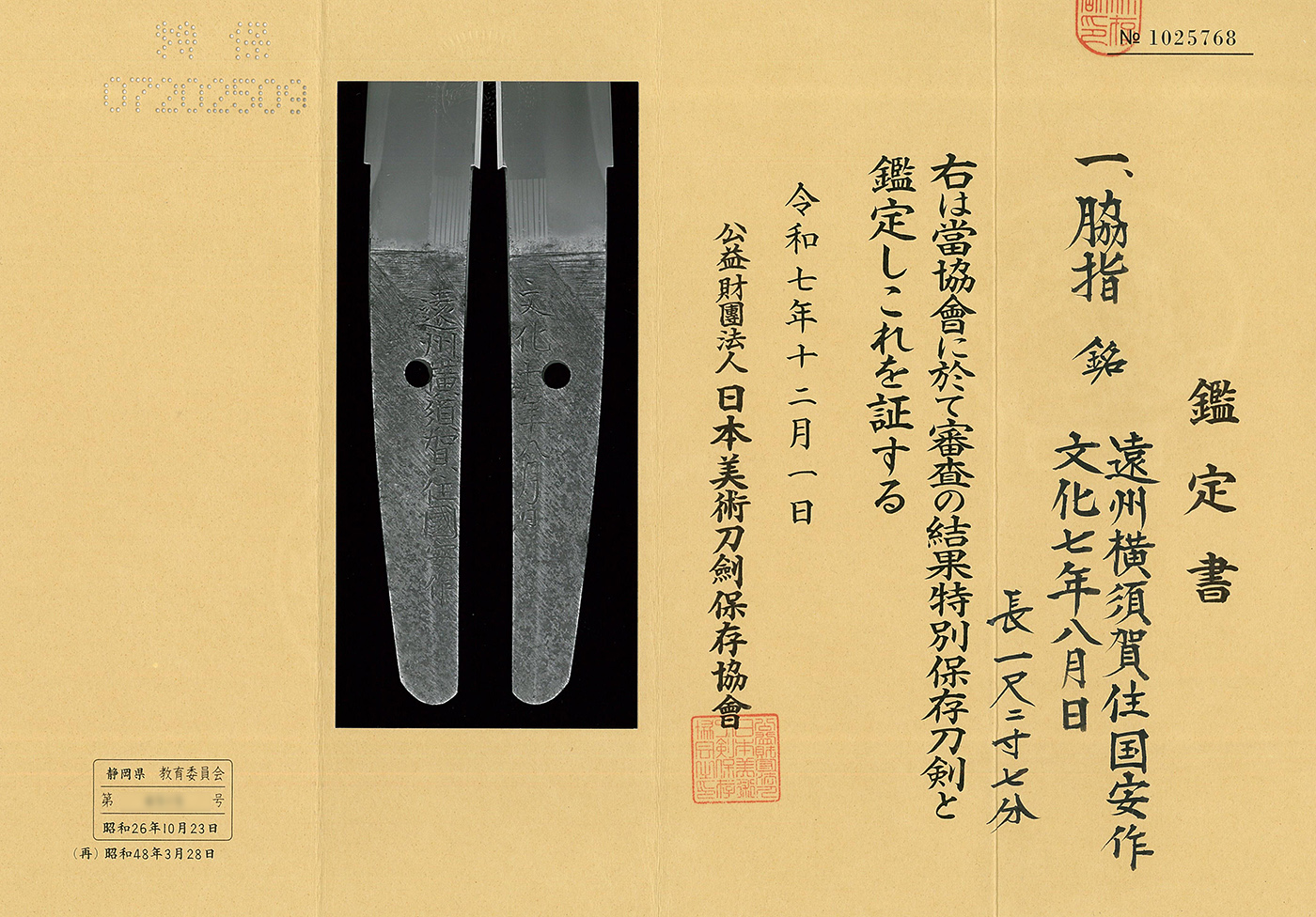 特徴:遠州横須賀住国安は本名を中塚初蔵、水心子正秀の門人で、はじめ一帯子三秀や近江国横須賀住三秀と銘を切っていたが文化元年に主命で國安と改銘している、新刀辨疑(鎌田魚妙 著)では正秀に不劣上手なりと高い評価をしている。New polish, good condition |