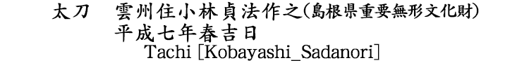 太刀 雲州住小林貞法作之 平成七年春吉日(島根県重要無形文化財) |