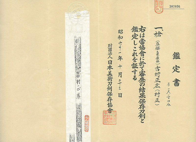特徴:村正は徳川家に祟ったと言う伝説があり、妖刀村正、徳川家に仇をなす「妖刀」であるとして知られている。 その為、村正は銘を潰されたり改竄された作品も多く、本作は吉村正廣と真鍮象眼銘に改竄された作品です。